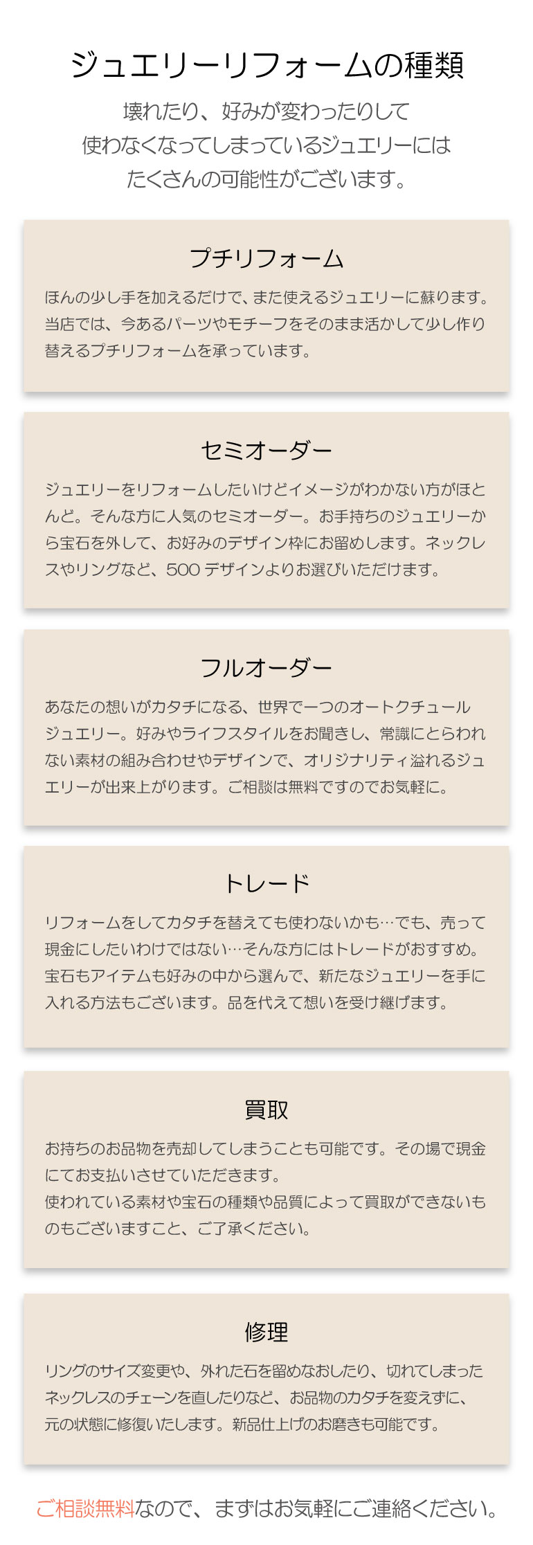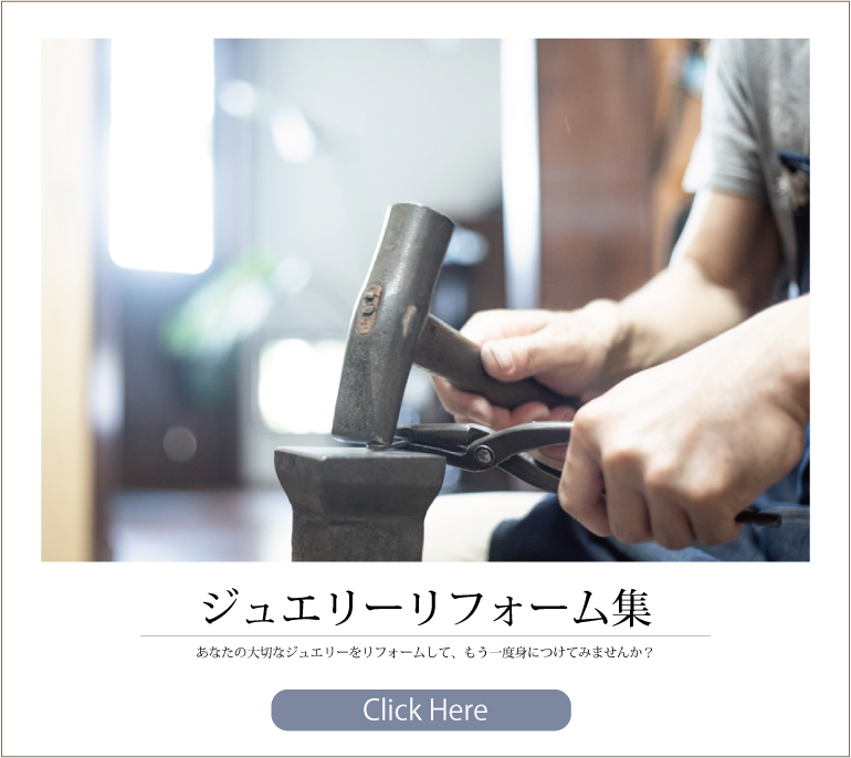 お手元に眠っている宝石をリフォームでお手軽に自分好みに作りかえませんか?金・プラチナの地金、使わなくなったジュエリーなどを買取りさせていただきます。ネックレスのチェーンは割引対象外とさせていただきます。