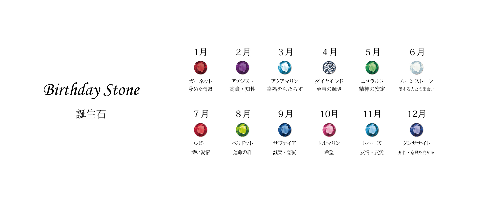 誕生石は生まれ月のお守りのストーン。身に着けるご自身の誕生石や、大切な方をお守りするために贈られた方の誕生石をお留め致します。刻印は3文字までお入れすることができます。(例)『N&M』など。